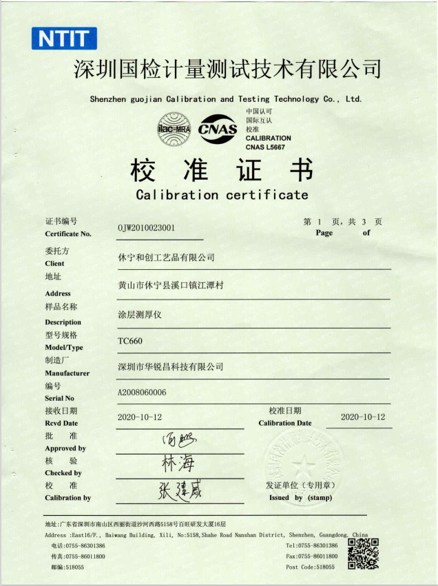 校準證書-HRC華銳昌涂層測厚儀TC660