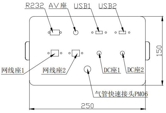 接插件安裝板上標(biāo)配安裝: RS232 接頭1個、AV座1個、USB接頭2個、網(wǎng)線座2個、DC座2個、氣管快速接頭PM06接頭1個