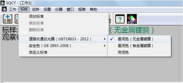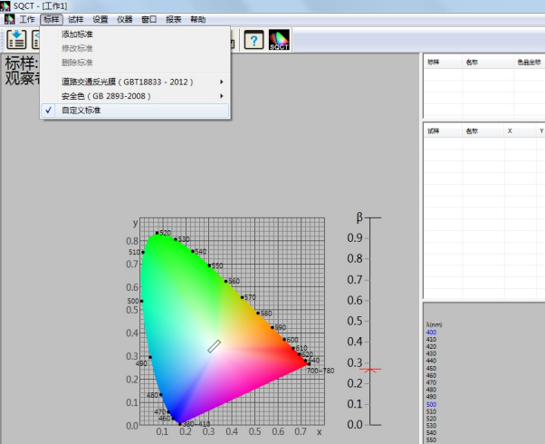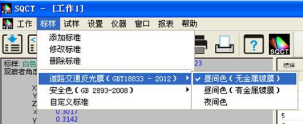 針對國內(nèi)交通路標(biāo)使用較多的標(biāo)準(zhǔn)GB/T18833,SQCT軟件將該標(biāo)準(zhǔn)中的標(biāo)準(zhǔn)色域納入其中,客戶只需根據(jù)自己需要進(jìn)行選擇即可。