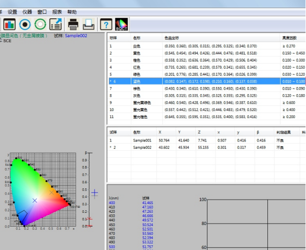 譬如如何判定藍(lán)色試樣是否在《GB/T 18833-2012道路交通反光膜樣》所規(guī)定的藍(lán)色區(qū)域內(nèi)(無金屬鍍層,晝間反光膜顏色),按照下面的步驟,將依次完成測量和判定。