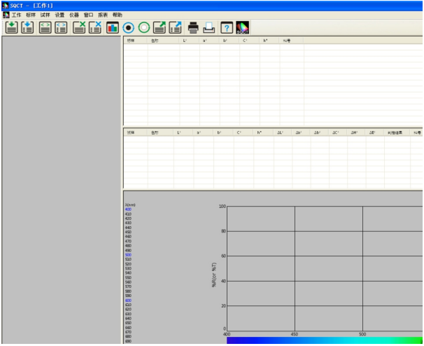 HRC68的交通路標(biāo)測試模塊主要是通過上位機(jī)軟件SQCT配合HRC68儀器實現(xiàn)的。 使用前需先安裝好SQCT上位機(jī)軟件,再連接HRC68儀器,然后打開上位機(jī)軟件,默認(rèn)為普通測試界面,如圖1所示,在該界面下可以完成CIE L*a*b、XYZ、ΔE*ab、ΔE*cmc、ΔE*00等色度數(shù)據(jù)的測試,詳細(xì)菜單和工具欄的介紹請參照該軟件自帶“色彩管理控制軟件使用說明書”,這里重點介紹交通路標(biāo)測試模塊。