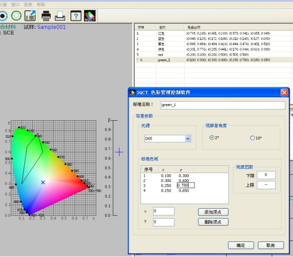 如圖7所示,修改上面建立的名稱為“green”的多邊形-容差標(biāo)樣,先選中該標(biāo)準(zhǔn),然后可以修改“標(biāo)準(zhǔn)名稱”“光源”“標(biāo)準(zhǔn)觀察者角度”“亮度因數(shù)”“色品坐標(biāo)”,修改完畢,點擊“確定”按鈕,則修改生效。