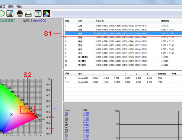 雙擊標(biāo)樣區(qū)域的藍(lán)色,如圖12中是S3所示部分,使藍(lán)色為當(dāng)前標(biāo)樣,藍(lán)色多邊形-容差標(biāo)樣(《GB/T 18833-2012道路交通反光膜樣》規(guī)定的藍(lán)色區(qū)域)則顯示在S4部分。