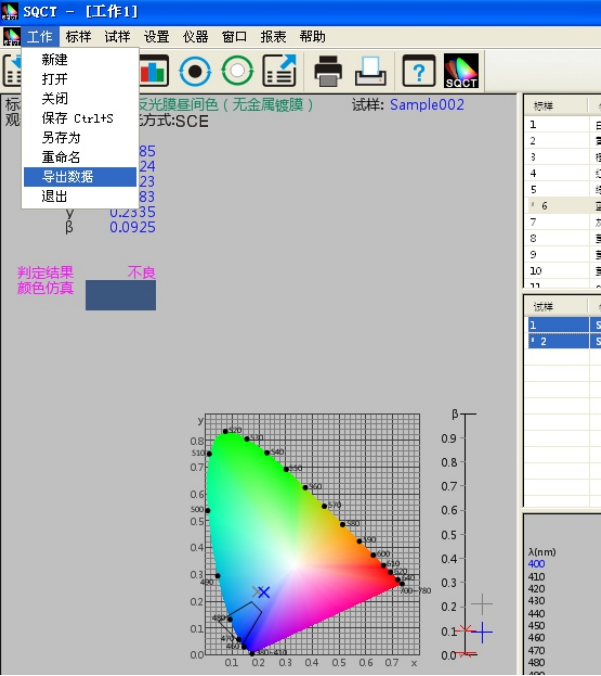 SQCT直接將《GB/T 18833-2012道路交通反光膜樣》的多邊形顏色區(qū)域做入軟件中,可以直接從菜單中選擇,“標(biāo)樣->道路交通反光膜GB/T 18833->晝間色(無金屬鍍膜)”如圖11所示。