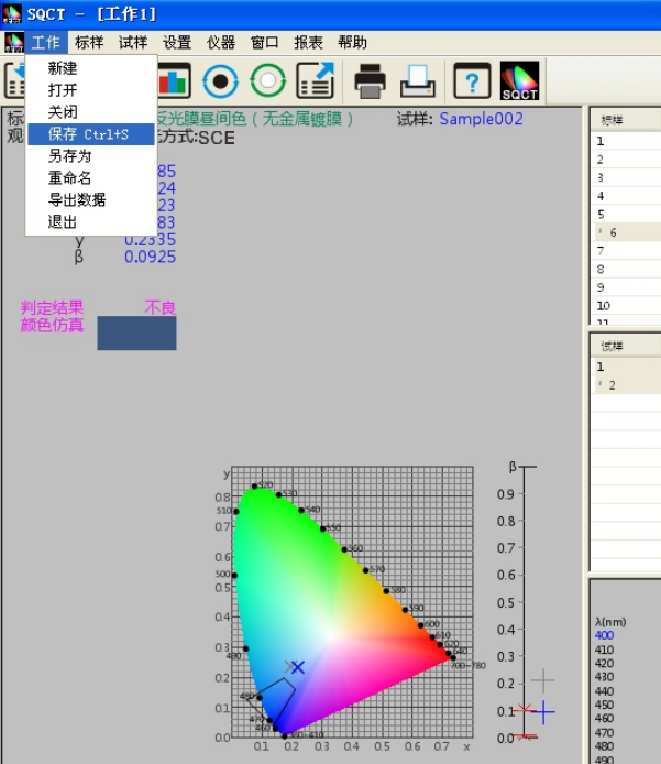 將測試樣品放在HRC68測量口徑上,貼緊,鼠標(biāo)點擊試樣測試快捷工具,如圖13所示。大約1.5秒時間,完成測試,測試數(shù)據(jù)如圖13中S5所示,在色品坐圖中的位置如S7所示,仿真及判定結(jié)果如S6部分所示。