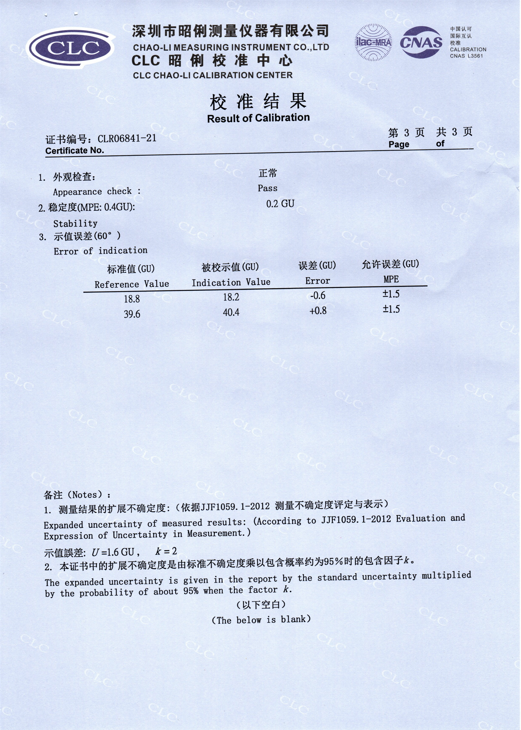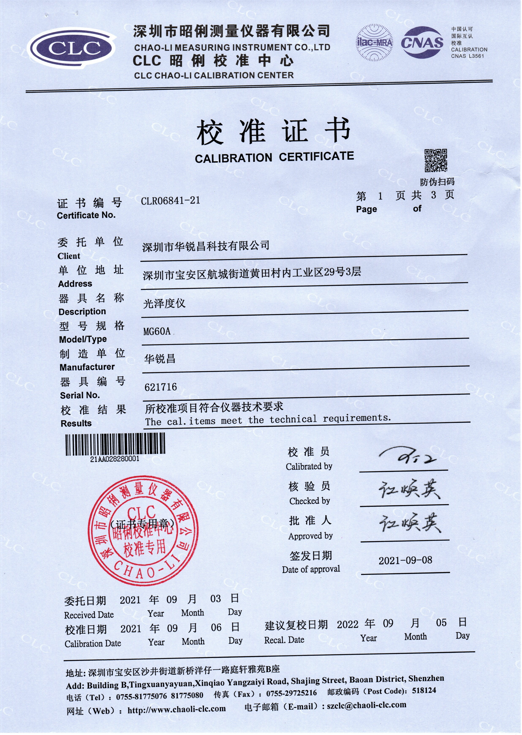 HRC華銳昌MG60系列光澤度儀校準(zhǔn)證書