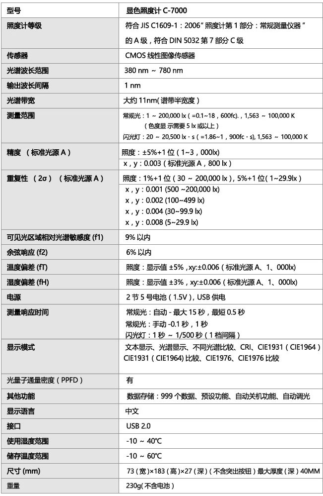 賽科尼可.世光SEKONIC顯色照度計C-7000是一款小巧、易用的光源(包括LED照明和EL照明)測量儀器,可提供CRI顯色指數(shù)、光譜輻射照度、峰值波長、三刺激值、色度、相關(guān)色溫、特征波長、色純度、照度以及差值測量的入門級解決方案,顯色照度計C—7000是一款輕便的手持式測量儀器,用于測量光源(包括全新的LED和EL光源)的色彩和照度。測量數(shù)據(jù)是以CRI顯色指數(shù)、三刺激值、照度、色度、特征波長、色純度、相關(guān)色溫和與目標(biāo)的差值形式顯示的,C—7000可搭配另購的閃光同步線進(jìn)行攝影閃光燈的光譜測量,作為標(biāo)準(zhǔn)配件隨附的實用軟件內(nèi)含了用于數(shù)據(jù)捕捉和分析的更多高級功能。