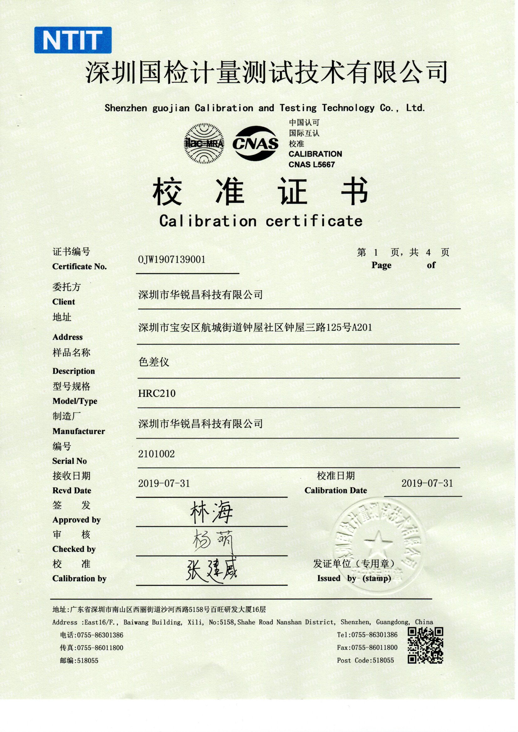 HRC華銳昌色差儀國家計量測試中心校準證書