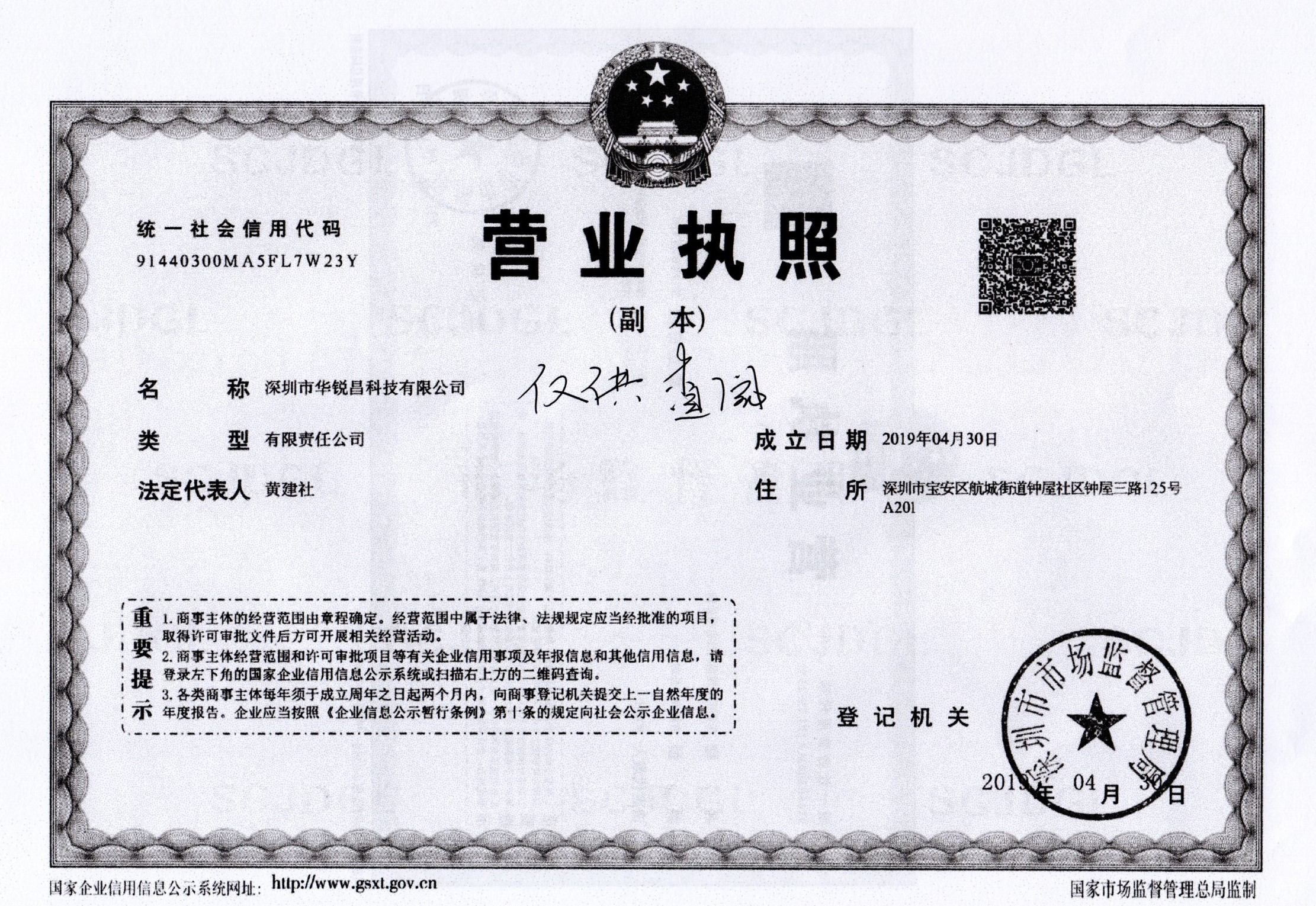 深圳市華銳昌科技有限公司營業(yè)執(zhí)照